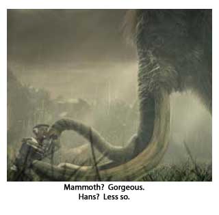 | Jacq: | | For you 'Merkins in the audience, I shall translate: scenery scrolls by while you're looking out the window on the train. And yes, I whole heartedly agree with the attention to detail bit: you can see yourself as you walk through puddles, and your footsteps leave rings in puddles and tracks in snow - tracks that faded with time as more snow fell. Lovely. There were squirrels and wolves and freakish made-up rabbit creatures that wandered the landscape. Fish that randomly jumped in ponds. Snow slid off of roofs. What I think I liked most of all about this sequel was the addition of multiple camera angles during conversational sequences. I feel that the rendering of the mammoths is also particularly note-worthy. We've waited two games to see them in the flesh, and their eventual appearance was not a disappointment. |