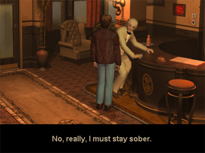 The man refused to run anywhere (a nice touch found in other games). Thirty-five NPCs to talk to... and half the time Martin has to sloooowly walk allll the way across the room, only to face that NPC and think to himself, "I have nothing whatsoever to discuss with this person."