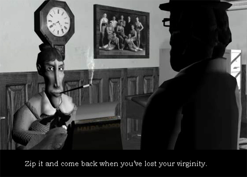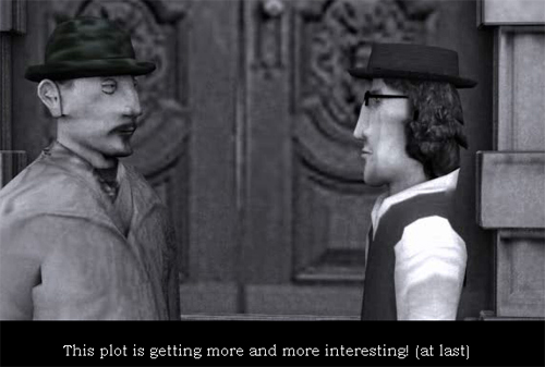 Sam: | What I was about to say before I was so rudely interrupted was that the fairly crude 3D is employed with considerable craft—the black-and-white lo-fi look alleviates the problem of unnatural textures and low detail, the heavily caricatured characters avoid the uncanny valley, and the awkward animation is made less artificial by making everyone—particularly the protagonist—rather stiff and fussy. |