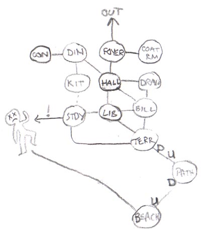 I'll begin by saying that this is a very good game, excellent in design and almost brilliant in execution (no pun intended). In fact, I would go so far as to say that this is one of the best murder mystery IF games I've ever played. It has the kind of replay value most games only dream of - you're investigating a murder where everyone has a good reason to kill, but the cause of death, time of death, and alibis change every time you play. So it's pretty interesting to play through more than once and see how things change.The reason I say "almost brilliant" and the reason this game doesn't get a higher score from me is this: I had reason to get a little angry on my first play through, because I was unable to win even though I knew who the murderer was and had covered all my bases in the investigation. This was due to a design flaw, something easily enough fixed for a later version, but a design flaw present during the comp nonetheless. Fortunately, my husband was a beta tester on the game and was able to help me figure out exactly what it was I needed to type to achieve the proper conclusion, but that shouldn't have been necessary. (Basically, I'd tried several different ways to tell the Chief about a certain person's alibi... all the different ways except the right way, it would seem, although the other things I had tried were quite sensible. >Tell Chief about alibis really should work, but does not. In fact, the response to that is, quite annoyingly, "This provokes no reaction." I also tried >Tell Chief about Debbie. For some reason, I didn't think the game would be able to pick up a more complex sentence, such as >Tell Chief about Deb's alibi, which, as it turned out, was how you had to express it. I have a couple of new grey hairs now, and they have Hugh Dunnett's name written all over them.)So yes, it's a great game that will do well in the competition, but I endured a little too much frustration to give it the eight it probably deserves. Here's hoping that "Dunnett" decides to clear things up with a second release.Oh, and for a glimpse into the scary inner workings of my brane, here's the map I sketched out to make sure I'd searched everywhere for the murder weapon: .