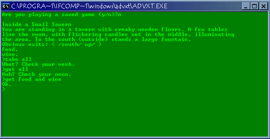 *** NOTE: Please read this entire review out loud in your best Strongbad voice.I just love Dunric. He is Mr. Smoooooth Old Skool. Not the sort of wimpy modern old skool, where you're crawling through a cave looking for treasure while being attacked by grues. No! I mean really genuine old skool, where >TAKE FOOD doesn't work but >GET FOOD does. I love the Windows-only terminal window, as well as the stylish neon-green-on-lime-green motif. Check this out! It loses a point for being able to parse more than two words at a time, sadly.One of the things I love about this game is its awesome battle simulations. Let me tell you about the amazing fight I had with a simple villager. All fights in ADVENTURE XT are TO THE DEATH, of course, because a fight that is not TO THE DEATH is not a fight worth having. Unfortunately, when I attacked the innocent villager, he turned out to really be a MONSTER VILLAGER, and I had forgotten to wield my sword, so I sat there and watched a blow-by-blow description of the fight (this took about thirty seconds and several screens on my Lappy 486), and after each blow it told me that I wasn't wielding anything. This being a fight TO THE DEATH, it would have been very unrealistic to take a moment from the fight to wield the sword I had in my inventory. Instead I just stood there until the MONSTER VILLAGER killed me.This is as it should be. Okay, okay, okay. I'll stop the parody and write a real review.In terms of prose and implementation this is one of the better Dunric games I've played. In its simple style it tries to set a nice scene, with lush green meadows and ponds and such, and does so in technically solid English without any obvious typographical errors. It lacks the drive and humor of his classic game Jesus of Nazareth, the game against which I now judge all Dunric games, however.All that having been said...not that he'll read this...but...Dunric, could you please join the 21st century? Please? There are authoring systems out there and everything. Inform 7 is really quite easy to learn. Honest!Then dammitall, just after I went and wrote this nice long review, the game was disqualified for containing copyrighted Smurfs I never had the patience to run into. Oh, well.